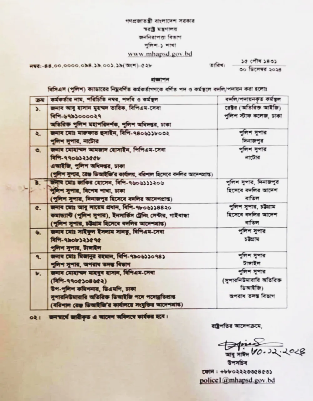 পুলিশ স্টাফ কলেজের রেক্টর সহ ঊর্ধ্বতন আর্ট কর্মকর্তা বদলি