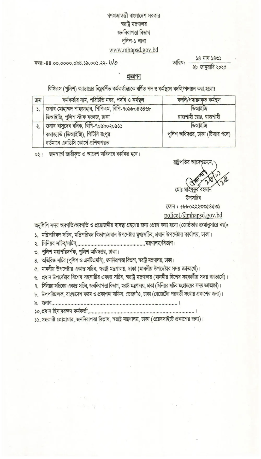 বাংলাদেশ পুলিশের রাজশাহী বিভাগের নতুন ডিআইজি নিযুক্ত হয়েছেন পুলিশ স্টাফ কলেজের ডিআইজি মোঃ শাজাহান। অবসরজনিত কারণে বেশ কিছুদিন ধরে রাজশাহী রেঞ্জের ডিআইজি পদ শূন্য ছিল। মোহাম্মদ শাজাহান পুলিশের ১৭ তম ব্যাচের কর্মকর্তা দীর্ঘদিন ধরে স্টাফ কলেজে কর্মরত ছিলেন। স্বরাষ্ট্র মন্ত্রণালয়ের পুলিশ ১ শাখার উপসচিব মাহবুবুর রহমান স্বাক্ষরিত এক প্রজ্ঞাপনে আজ এই আদেশ জারি করা হয়। একই আদেশে পুলিশের রংপুর পিটিসির কমান্ডেন্ট এন্ডিসি কোর্স সম্পন্ন করে প্রত্যাবর্তনকৃত ডিআইজি বাসুদেব বনিক কে পুলিশ পুলিশ হেডকোয়াটারের ডিআইজি টি আর পদে বদলি করা হয়েছে।