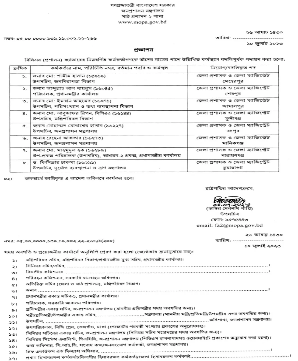 প্রজ্ঞাপনে বলা হয়- মেহেরপুর, জামালপুর, শেরপুর, মুন্সীগঞ্জ, রংপুর, মানিকগঞ্জ, নারায়ণগঞ্জ ও চুয়াডাঙ্গায় নতুন জেলা প্রশাসককে দায়িত্ব দেওয়া হয়েছে।