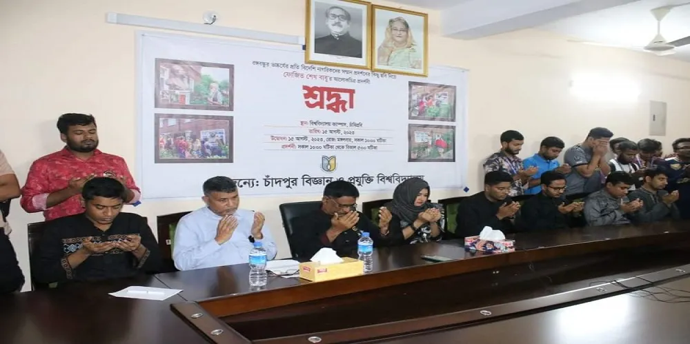 জাতির পিতা বঙ্গবন্ধু শেখ মুজিবুর রহমানের ৪৮তম শাহাদাত বার্ষিকী ও জাতীয় শোক দিবসে শিক্ষামন্ত্রী ডা. দীপু মনির উপস্থিতিতে বঙ্গবন্ধুর প্রতিকৃতিতে ফুল দিয়ে শ্রদ্ধা নিবেদন করেছেন চাঁদপুর বিজ্ঞান ও প্রযুক্তি বিশ্ববিদ্যালয়ের উপাচার্য প্রফেসর ড. মো. নাছিম আখতার।